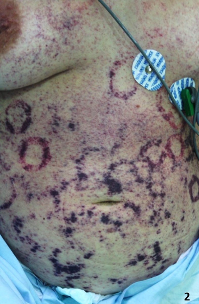 Skin involved is classically described as a petechial & purpuric rash involving the periumbilical area, also known as the “thumbprint purpura sign" (2), which some authors propose to be a pathognomonic manifestation of disseminated strongyloidiasis. 5/5