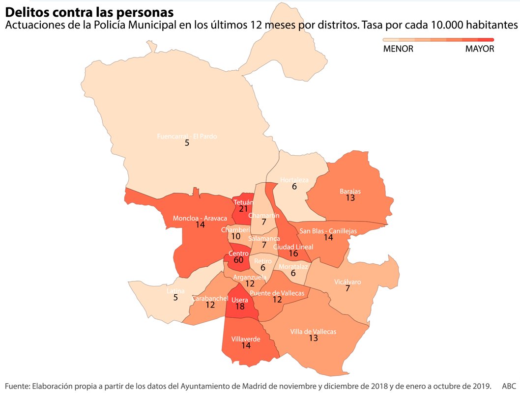 Y llama la atención que en otros, donde el número de locales comerciales es bastante bajo en comparación (Hortaleza 6.903 locales a pie de calle), la tasa de criminalidad es también muy baja. ¡A ver si es que las farolas funcionan bien!