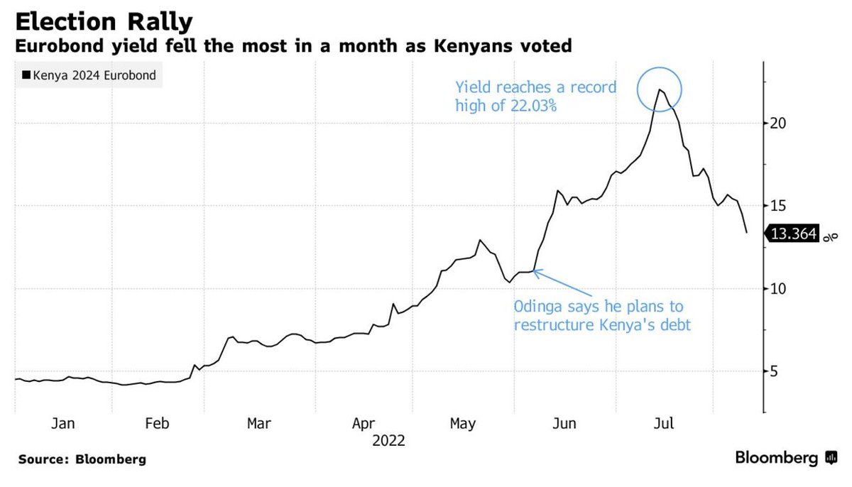 The yield on Kenya’s $2 billion of debt due in 2024 fell the most in a month while voting was under way. It was at 13.41% by late Tuesday in Nairobi and is the lowest since June 7, according to data compiled by Bloomberg.