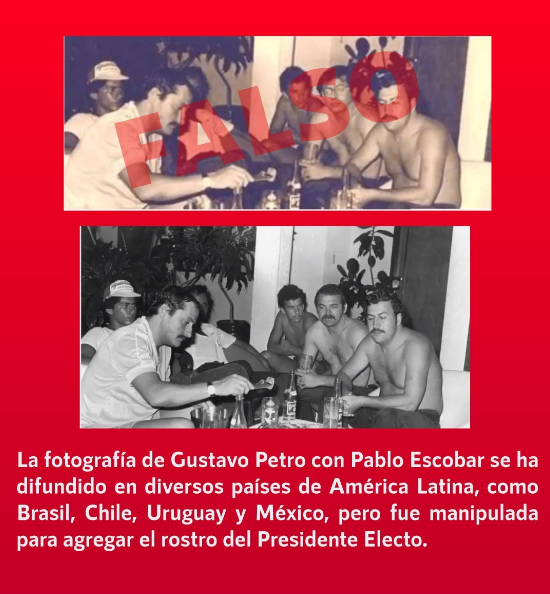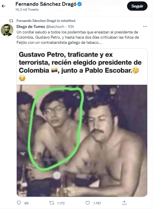 Manipulación de imagen de Pablo Escobar donde le ponen la cabeza de Petro a la persona que tiene al lado. Tuit y botón de RTs de bots.