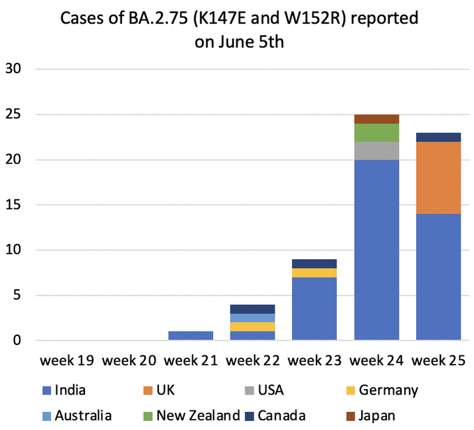 La nueva variante, identificada como BA.2.75, se encontró por primera vez en una secuencia tomada en India a principios de junio. Desde entonces, la variante se ha visto en Australia, Canadá, Japón, Alemania, Nueva Zelanda, Reino Unido y Estados Unidos.
