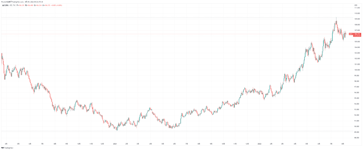 都知道美元指数是衡量美元价值的参考,这个数据在截止到目前的熊市过程中因为加息缩表等宏观状态的改变而一直上升,最高触及到109的上方,是2002年6月以来的最高值,而这个数字则代表了更多的投资者相对于风险投资来说更加的愿意持有美元现金或者是美债等美元等价资产,尤其是美债在熊市更加受到欢迎。