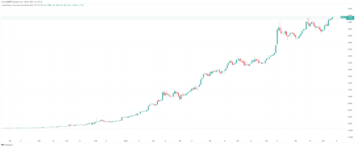 尤其是一年期美债已经走出了历史最高的收益率,我甚至查了一下国内银行的收益,3.3%的R1无风险收益一年期以内是几乎不存在的,相信这份收益即便是放在国内都会被抢购,但是在美国竟然“无人问津”,甚至到了今天早晨还是处于继续上升的状态。这种情况下就可以确认有较大规模的连续资金从美债市场离场。 Image