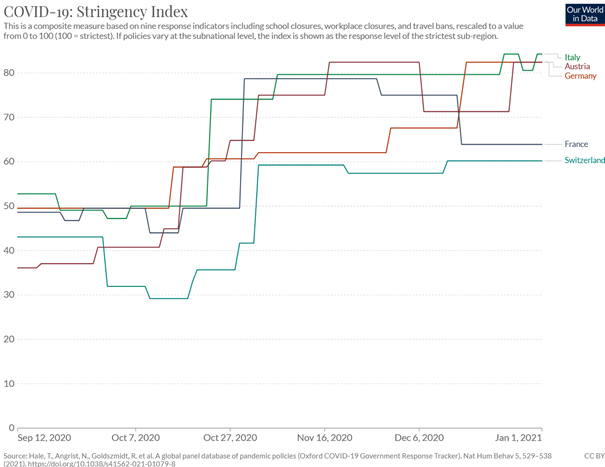 Die CH hat die Massnahmen im Oktober 2020 zuerst noch gelockert und dann viel zögerlicher wieder verschärft als die vier grossen Nachbarländer.
