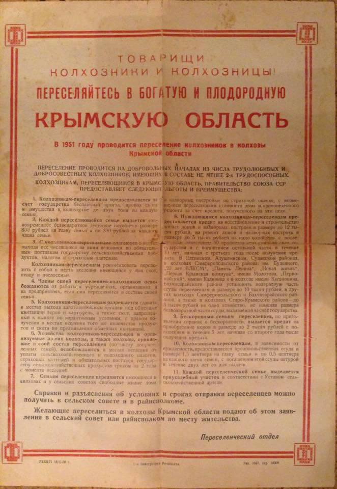 This 1951 poster promises Russians who come to Crimea lands huge financial support, freedom from many duties etc. Of course, these Russians just took the houses and lands of Crimea Tatars - for free. In a few years, they started to say, "we feel at home" /4