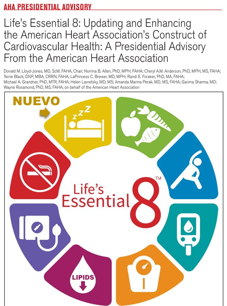 📏Métricas p/ promoción d la salud 1) Alimentación saludable🥦 2) Actividad 🏃 3) Evitar nicotina🚭 4) 🆕Sueño saludable💤 5) Peso saludable 6) Control d lípidos 7) Control d glucosa 8) Control d presión arterial