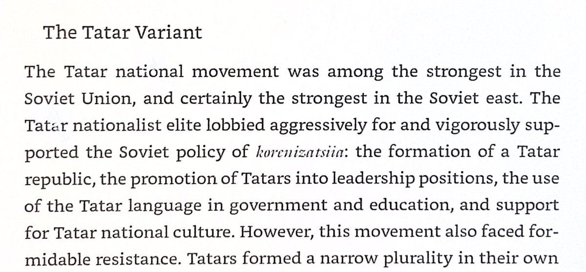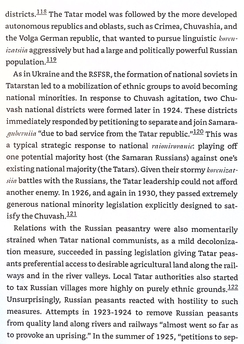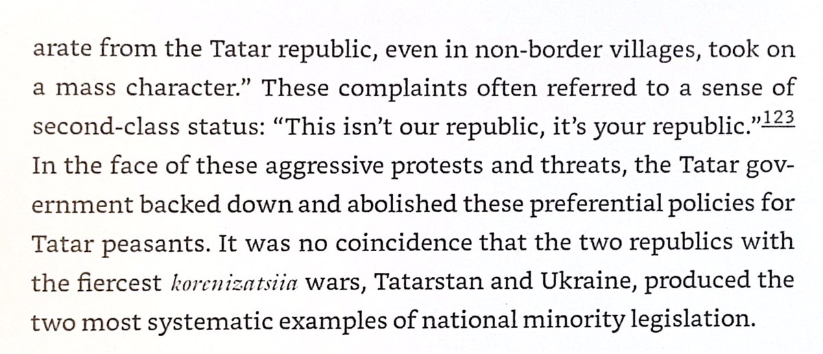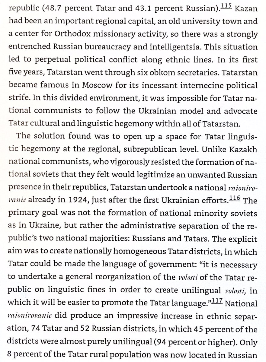 Volga Tatars were only a plurality of Tatarstan’s population & they didn’t control the region’s main city of Kazan. Attempts to consolidate Tatar power & set up ethnic privileges failed, so the Tatars focused on strengthening Tatar language & government in rural Tatar areas.