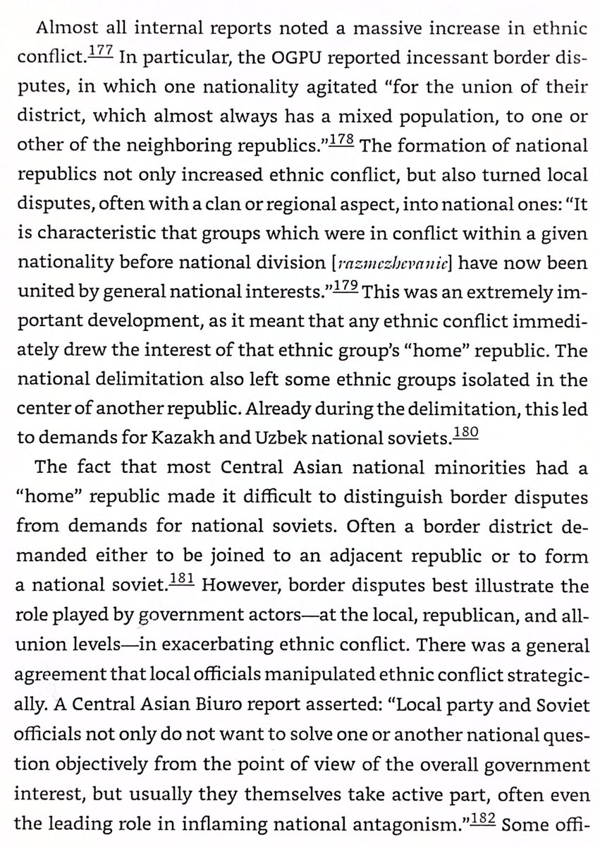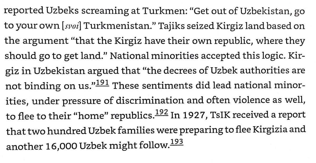 Tajiks, Uzbeks, Turkmens, & Kirgiz were intensely concerned about the borders of their republics & constantly feuded (often violently) with each other. Moscow had to constantly referee.