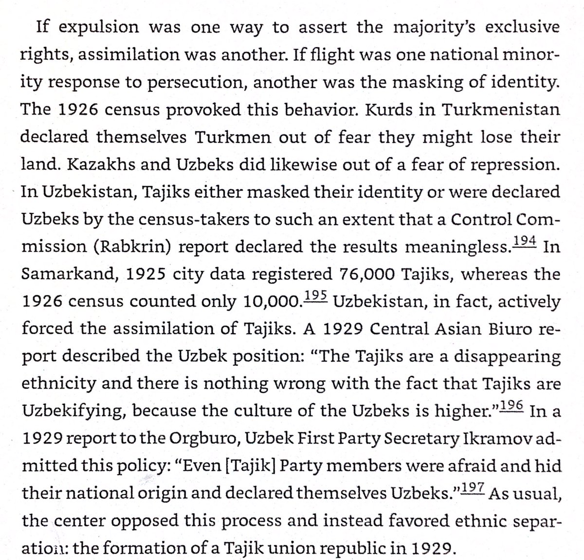 Some ethnic minorities in Soviet Central Asia decided to transmogrify into the majority ethnicity in order to keep their lands & avoid discrimination. Kurds declared themselves Turkmen, & Tajiks declared themselves Uzbeks. Soviet Tajikistan wasn’t created until 1929.