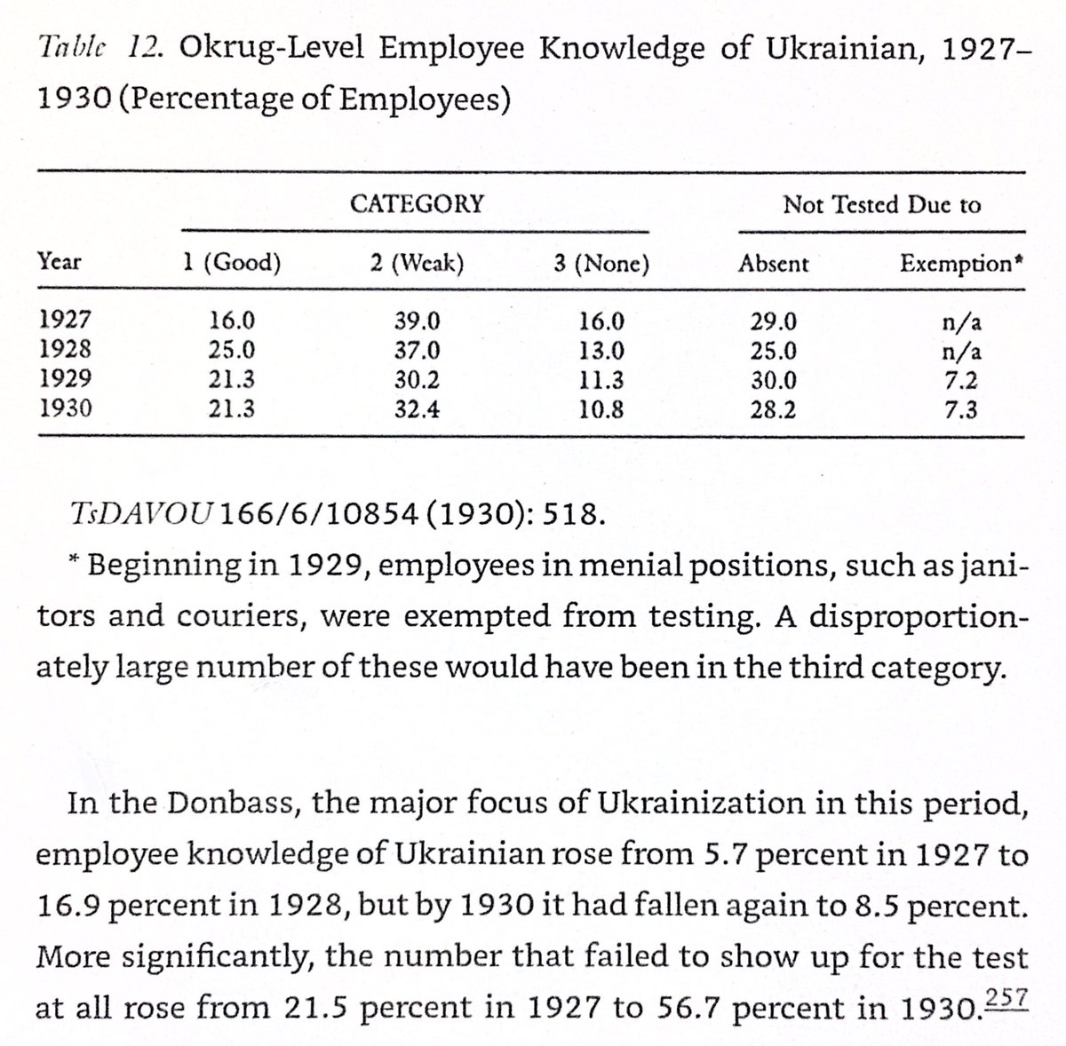 Less than 10% of workers in the Donbass in the 1930s knew Ukrainian. Ukrainian language was also known by only a minority of workers in Kiev and Kharkov.
