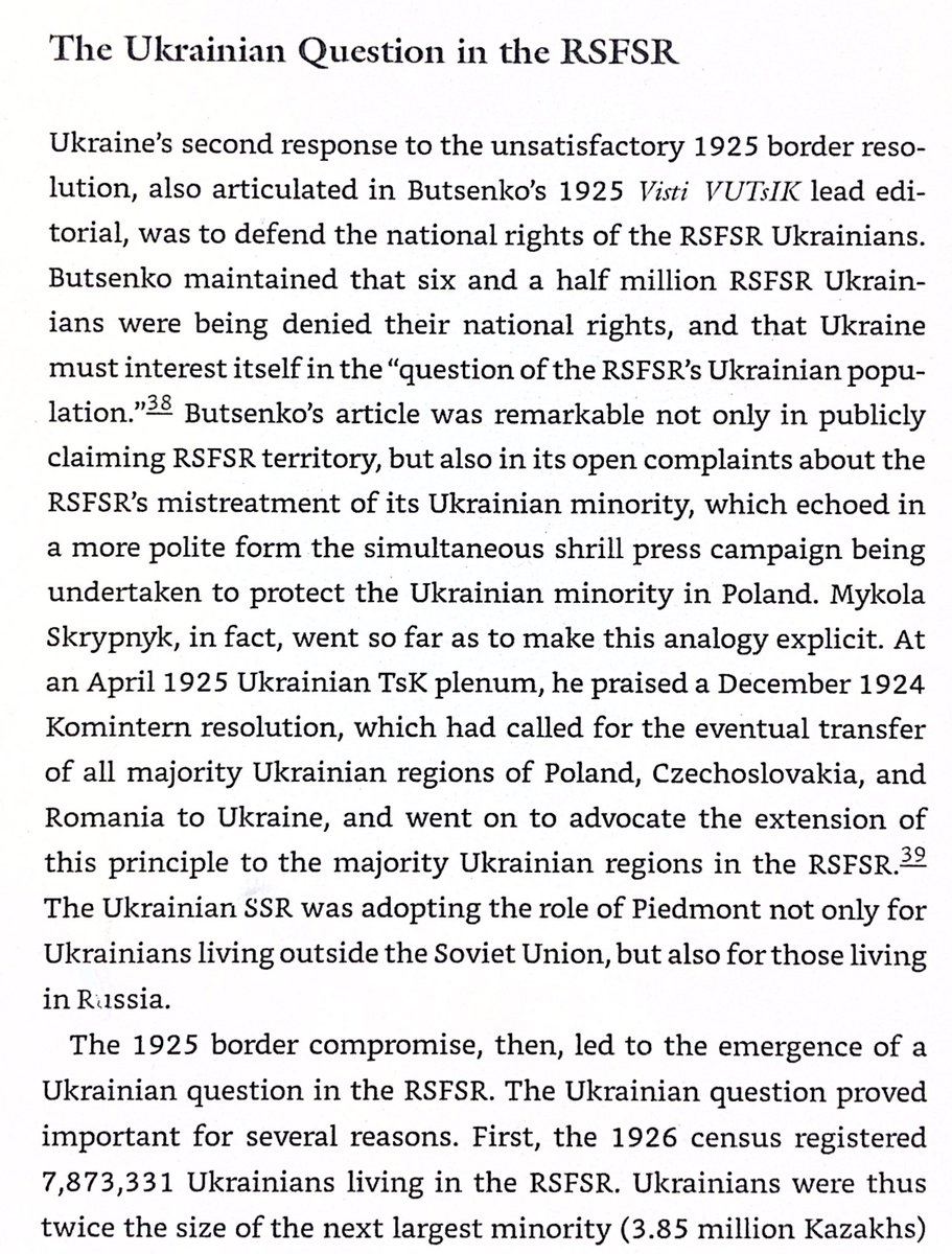 6.5 million Ukrainians lived in 1925 Soviet Russia, & were a majority of the population in Voronezh, Kursk, & under certain definitions the N Caucasus kray. Soviet Ukraine wanted to annex the majority Ukrainian parts of Russia. Only 2/3rds of Ukrainians in Russia spoke Ukrainian.