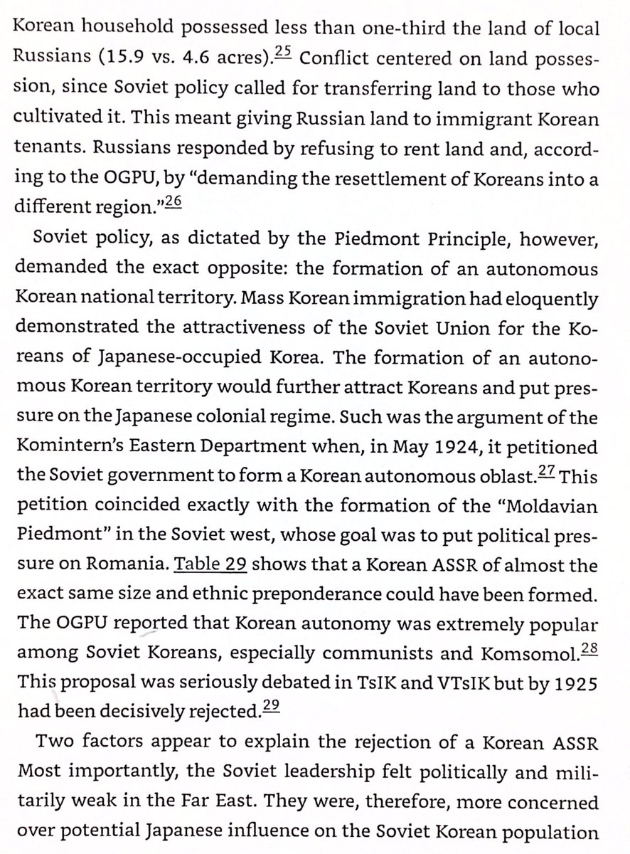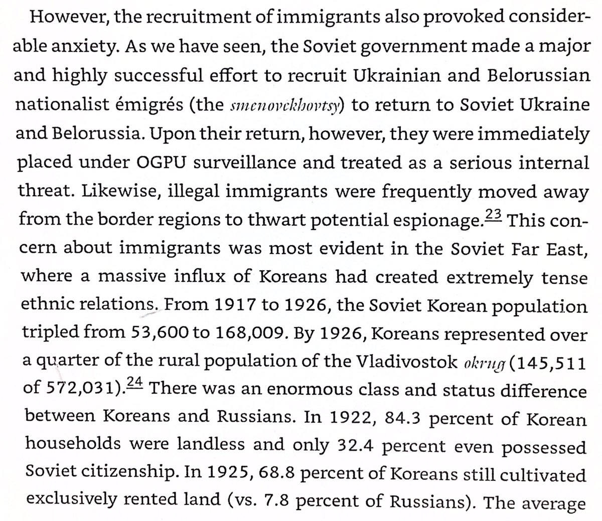 USSR’s Korean population tripled from 1917 to 1926, largely due to immigration. There were plans for a Korean oblast in far east to put pressure on the Japanese. However, local communists didn’t trust the Korean immigrants so the Koreans only got a national region & some soviets.