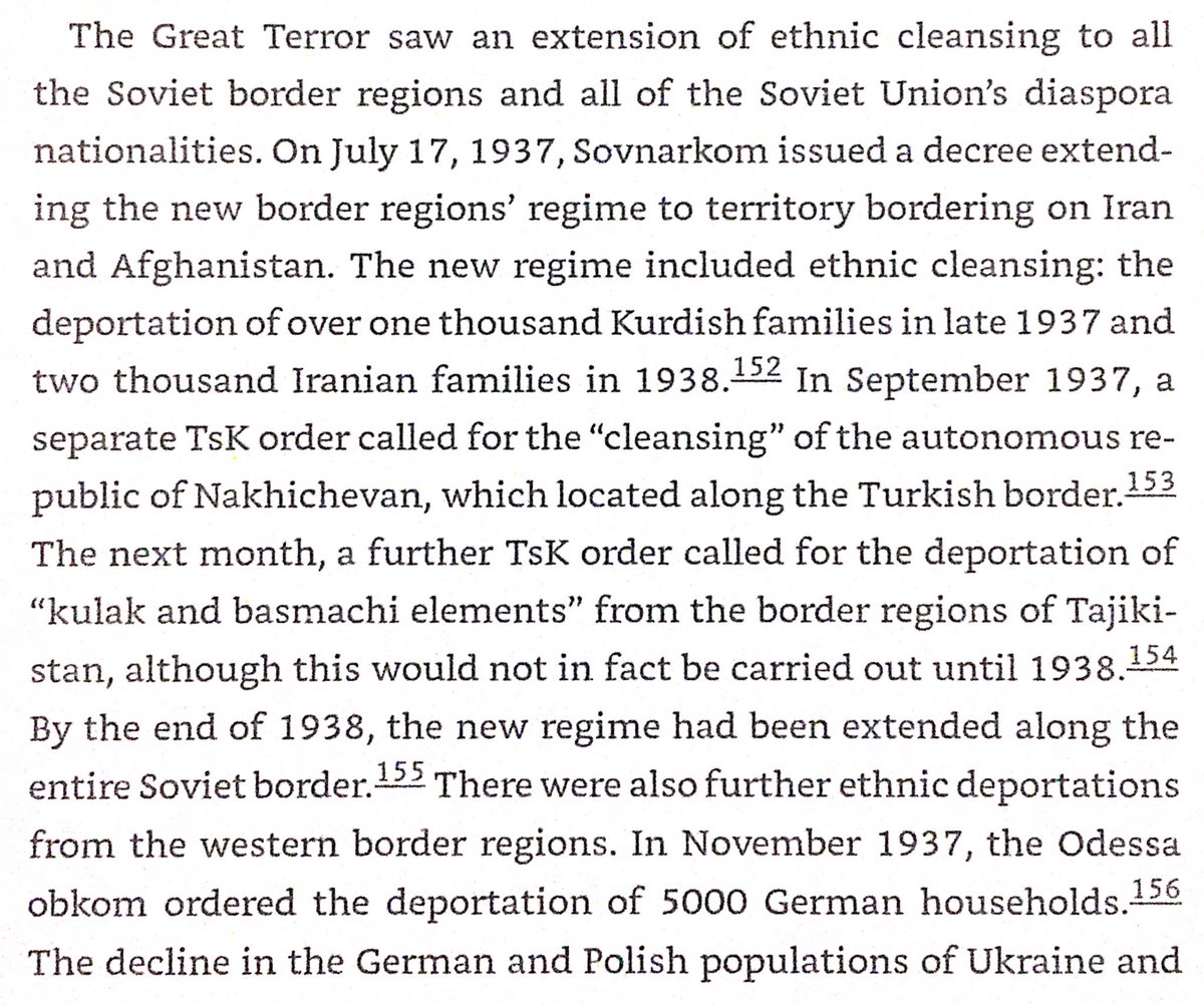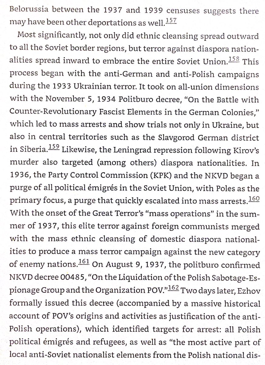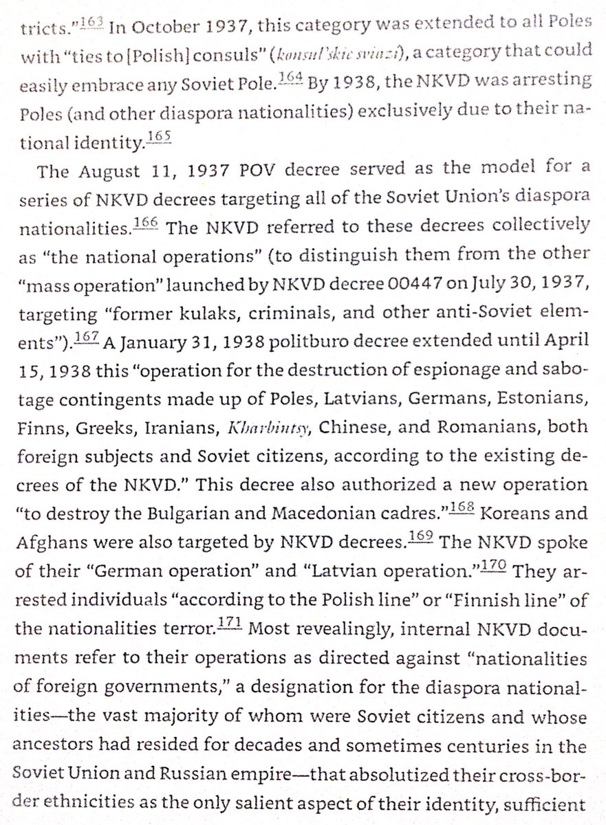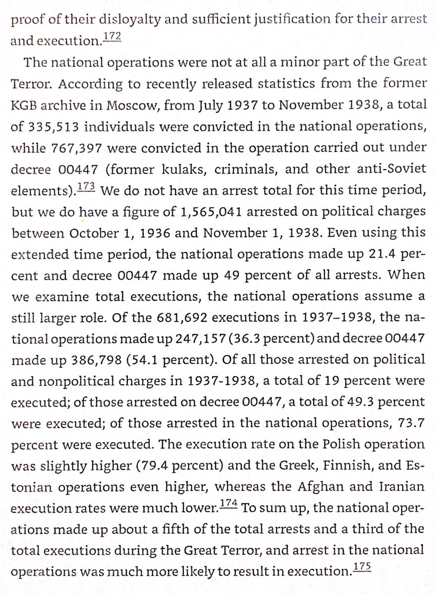 The 1936-1938 Great Terror included a number of national operations aimed at supposedly disloyal ethnicities in the USSR, including 🇵🇱 🇱🇻 🇩🇪 🇪🇪 🇫🇮 🇬🇷 🇮🇷 🇨🇳 🇷🇴 🇧🇬 🇲🇰. The victims of those purges were a fifth of total arrests & a third of total executions in the Great Terror.