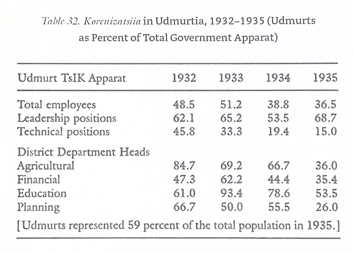 As elsewhere, indigenization peaked in Udmurtia in 1932, when the Udmurts were about 59% of population but 62.1% of leaders.