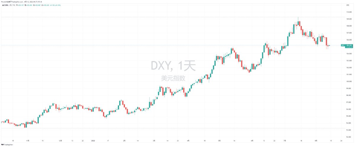 都知道美元指数是衡量美元价值的参考,这个数据在截止到目前的熊市过程中因为加息缩表等宏观状态的改变而一直上升,最高触及到109的上方,是2002年6月以来的最高值,而这个数字则代表了更多的投资者相对于风险投资来说更加的愿意持有美元现金或者是美债等美元等价资产,尤其是美债在熊市更加受到欢迎。