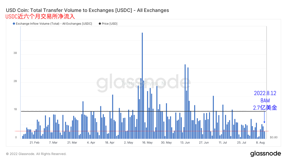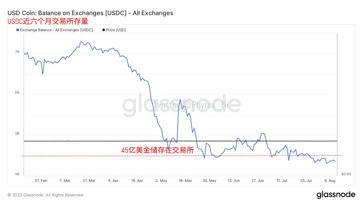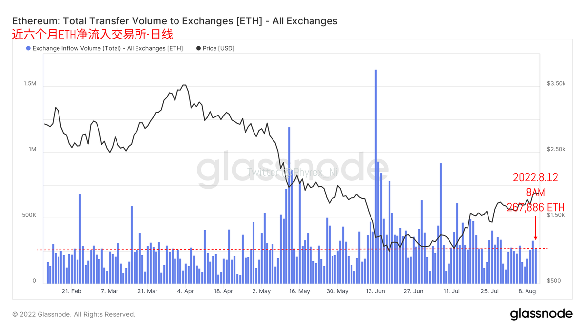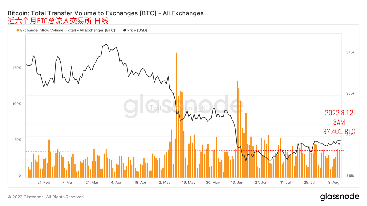 而且从交易所的存量数据来看,因为更多的关注依然是在 #ETH 的合并上,优势相对抛压ETH的购买情绪更加的旺盛,所以交易所得ETH存量使出于下行的趋势,更多的筹码被用户从交易所提现离场,而 #BTC 随着盈利用户的增加,更多的筹码转移进入了交易所,准备寻找合适的离场机会,所以存量反而是在增加。