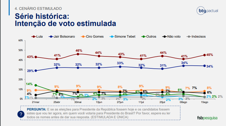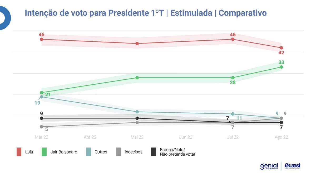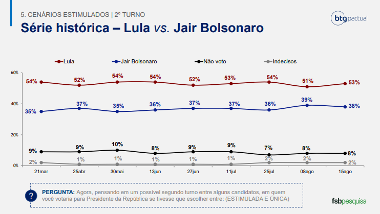 Bolsonaro recuperou 10 pontos em 5 meses enquanto Lula se manteve estável.