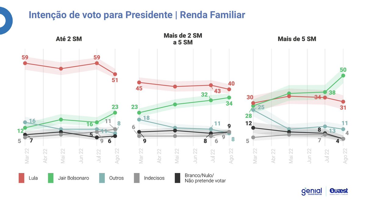 E aí mais uma vez temos a volatilidade dos eleitores de menor renda e a disparada dos eleitores mais abastados onde as variações foram 7% e 12%, respectivamente.