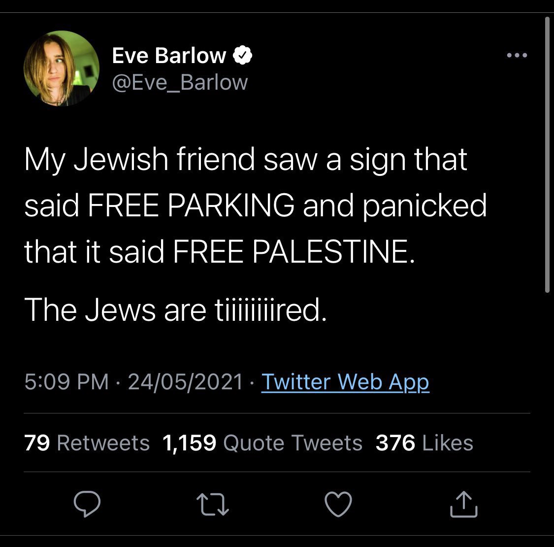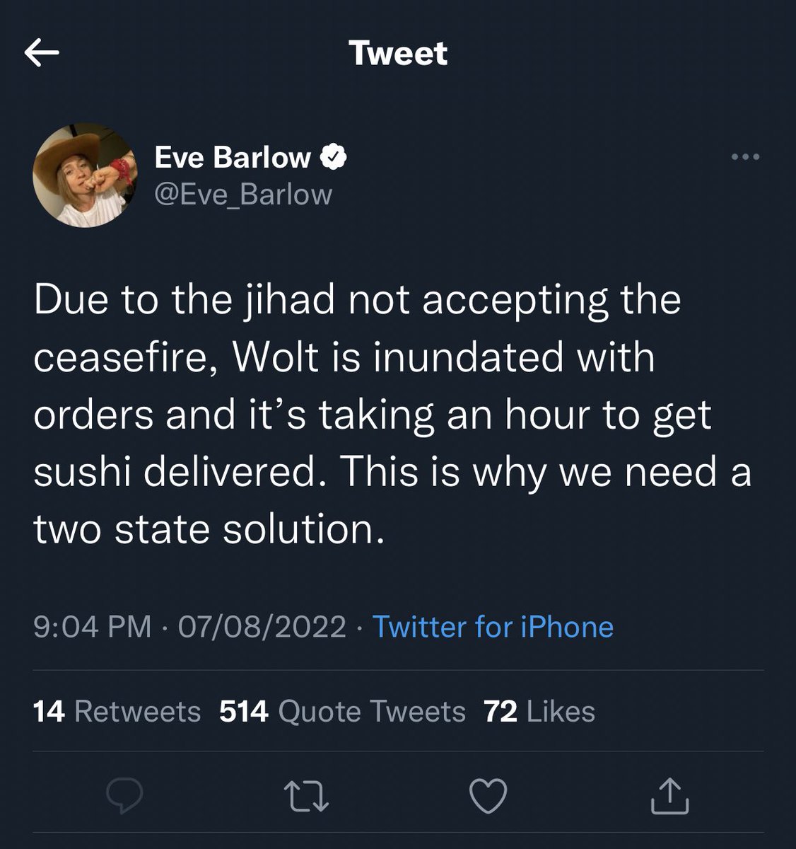A few days ago Eve barlow made this tweet, complaining that her and amber’s sushi is taking too long because israel is busy bombing gaza of course. The day before she made that tweet 6 palestinians kids were fatally murdered by israel