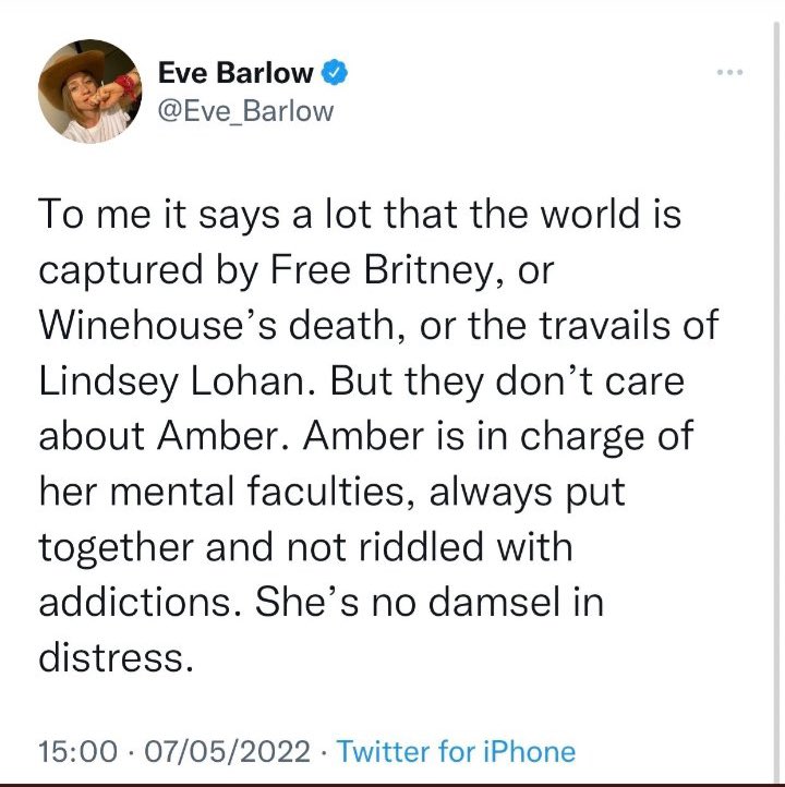 Eve also claimed that Amber Heard is “put together” unlike Britney Spears who’s “not in charge of her mental faculties” and Lindsey Lohan who is “riddled with addictions” this makes amber deserving of support because she is no damsel in distress.