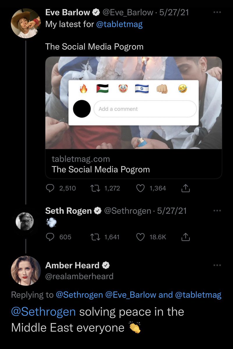 Amber Heard has also been vocal in suppoting Eve Barlow’s beliefs. She publically defended her when seth rogan rightfully called eve out (seth is jewish btw)