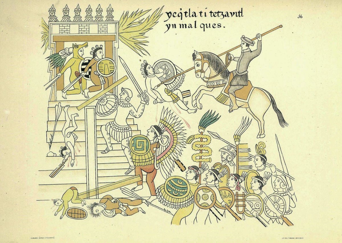 Esta imagen del Lienzo de Tlaxcala representa el encuentro entre Hernán Cortés y Cuauhtémoc, seguramente el penacho de plumas de Cortés representa su liderazgo. Arriba se lee una frase en nahua: «Con esto se acabaron los mexicas».