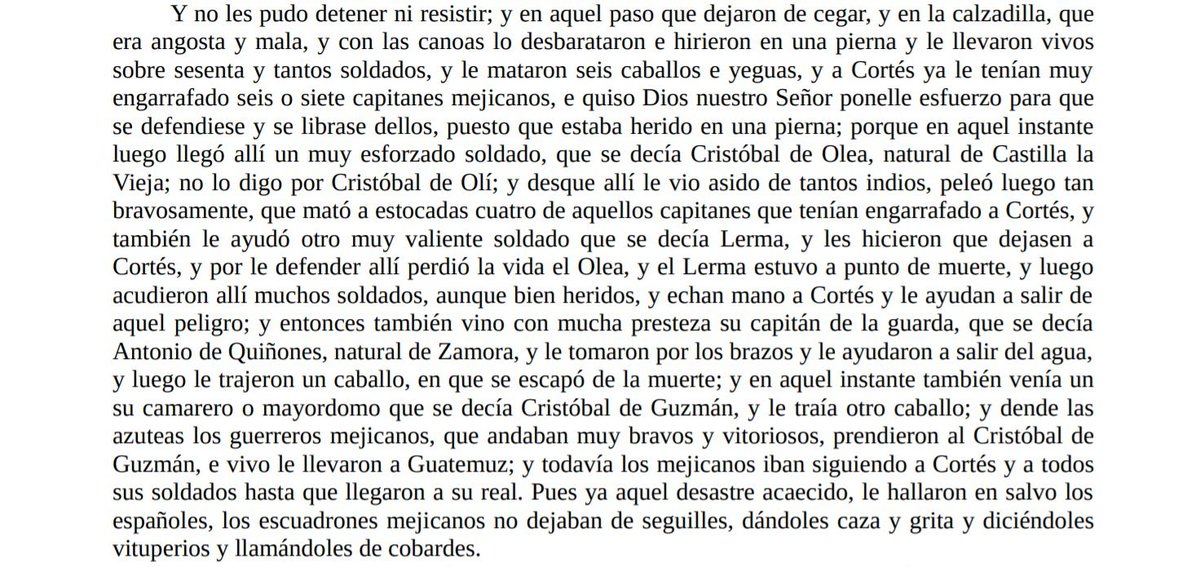 «...y a Cortés ya le tenían muy engarrafado seis o siete capitanes mejicanos (...) estaba herido en una pierna».