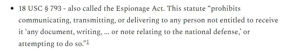 3/ Espionage Act's plain language does not require material related to "national defense" to be classified. (Preliminary research confirms my reading but want to dig deeper).