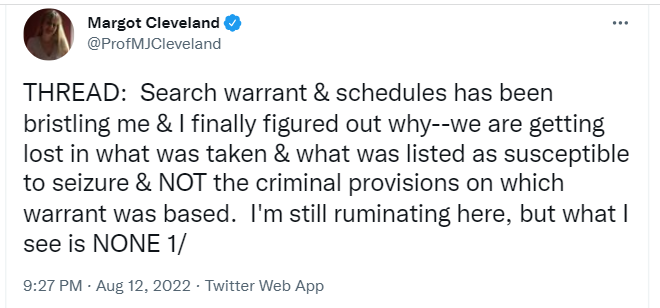 THREAD: Search warrant & schedules has been bristling me & I finally figured out why--we are getting lost in what was taken & what was listed as susceptible to seizure & NOT the criminal provisions on which warrant was based. I'm still ruminating here, but what I see is NONE 1/