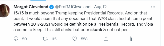 15/15 is much beyond Trump keeping Presidential Records. And on that point, it would seem that any document that WAS classified at some point between 2017-2021 would be definition be a Presidential Record, and viola a crime to keep. This still stinks but odor skunk & not cat pee.
