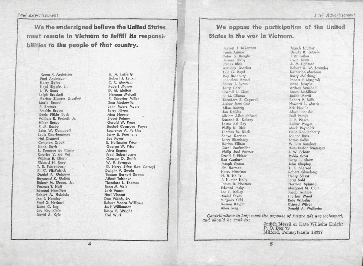 Por cierto, aquí tenéis dos listas con los escritores de CF que, por ejemplo, estaban a favor y en contra de la guerra del Vietnam. (Espero no derribar ningún mito).