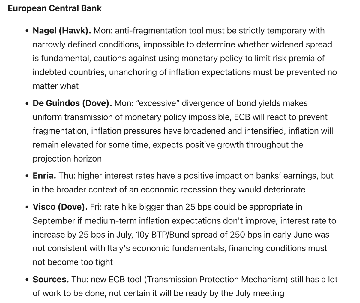 /3 Next up are short summaries of statements from all G8 central bankers. Some weeks there are more, some weeks less. Here's an example of ECB hawks and doves battling it out on the new anti-fragmentation tool: