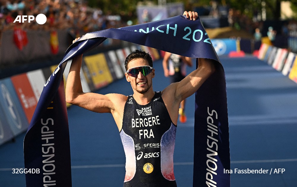 [A LA UNE 20H] Le Français Léo Bergère a été couronné champion d'Europe de triathlon à Munich, où l'équipe de France a réalisé le triplé avec Pierre Le Corre, deuxième, et Dorian Coninx, troisième #AFP 3/5