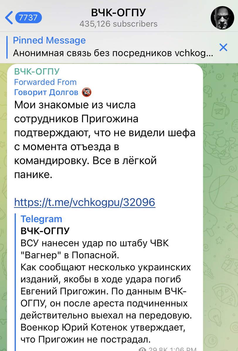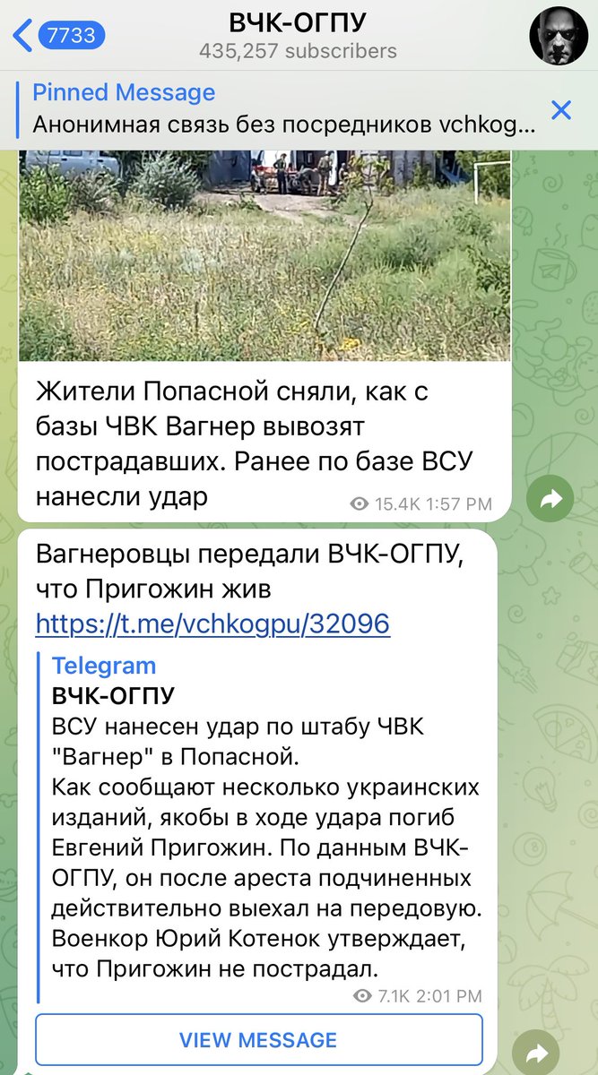 Another Russian Telegram channel says that the people he knows who work for Prigozhin say that haven’t seen him since he went to the front. “Everyone is in a mild panic.” 7/ t.me/vchkogpu/32101