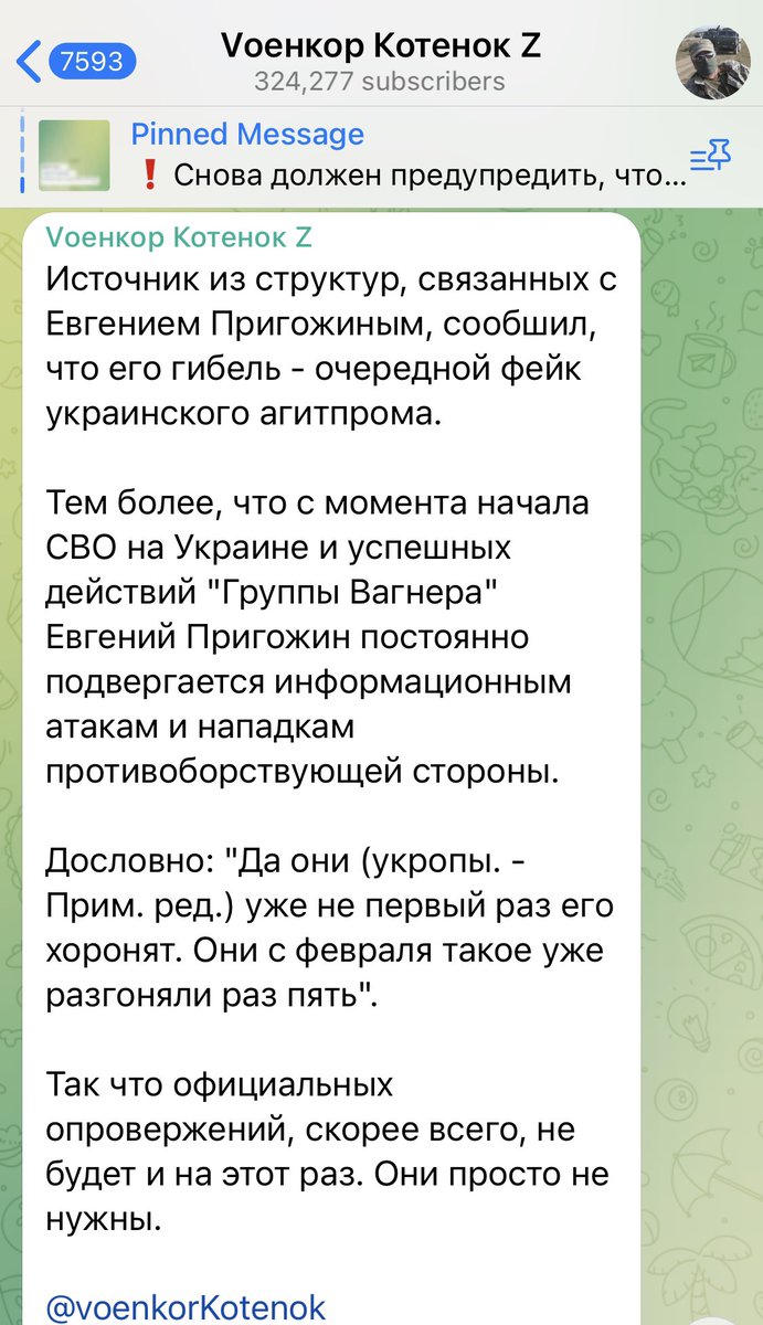 Another Russian account is saying that his sources say Prigozhin is alive. 9/ t.me/voenkorKotenok…