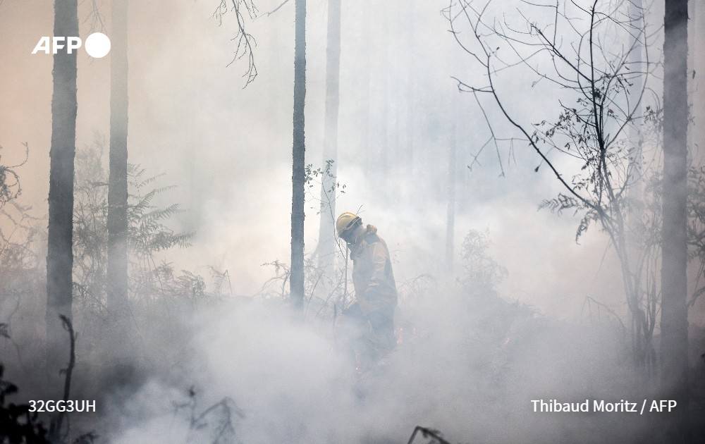 [A LA UNE 18H] Les pompiers poursuivaient samedi leur lutte contre les incendies notamment en Gironde, dans les Landes et en Bretagne, dans l'attente de l'arrivée en soirée d'orages et de pluies, sans savoir encore si elles aideront ou pas à l'extinction des feux #AFP 2/5