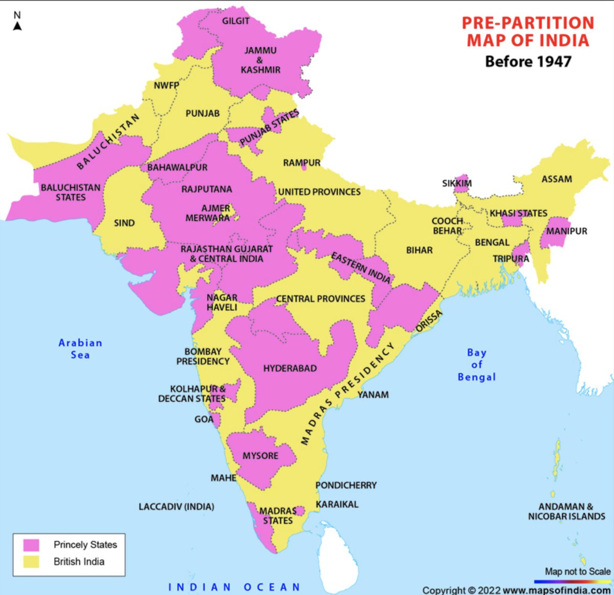 The map shows something strange: Madras state at one time spanned coast to coast! Today it is smaller than Karnataka in area with about the same population size.