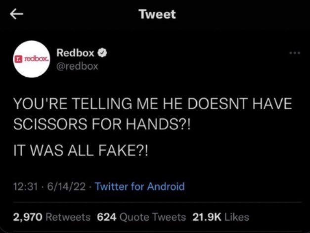 Amber Heard said in an interview that Johnny Depp is such a good actor that he managed to convince people that a fictional character he played had scissors for hands. Redbox made a tweet to mock her about it.