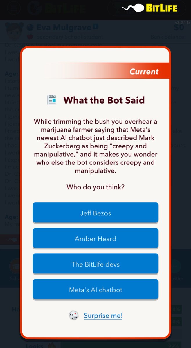 The app @BitLifeApp included “Amber Heard” as an answer to the question of who could be considered “creepy and manipulative”.