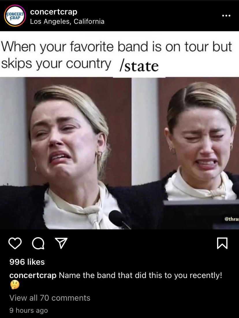A popular concert related page, @Concert_Crap, used pictures of Amber Heard testifying about being raped to make a ‘joke’ on how it feels when their favourite band is on tour and skips their country.