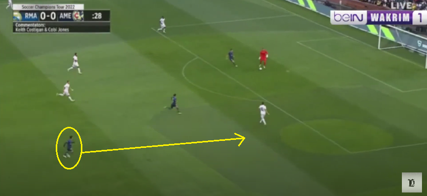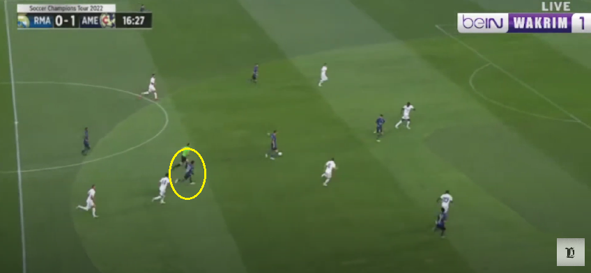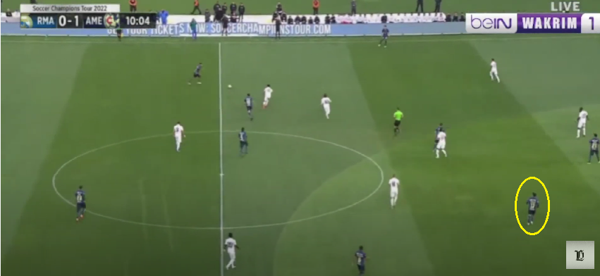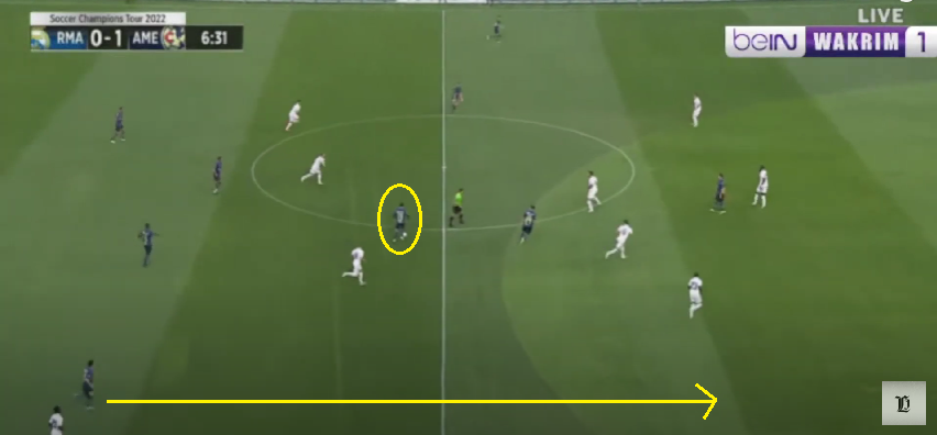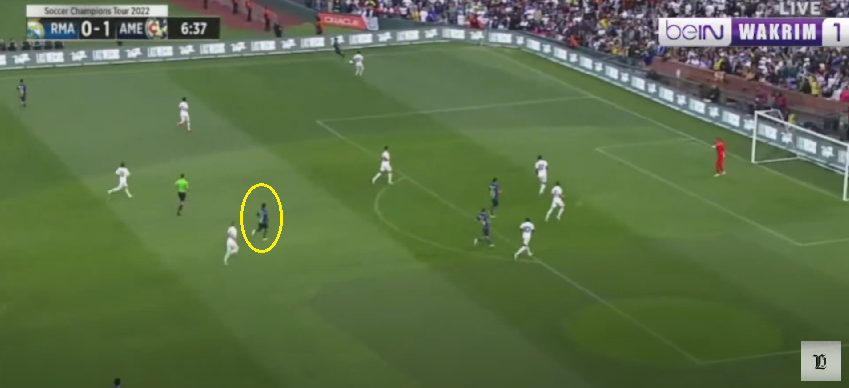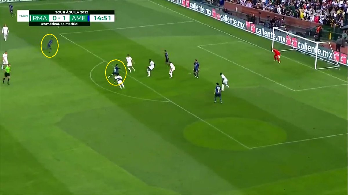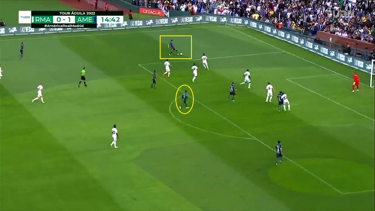 He escogido el amistoso vs. RM para hablar sobre el rol/desempeño de Zendejas con un lateral largo. Ante el Madrid, el 17 inició un tanto estático en banda (1ª foto), pero rápido entendió que por dentro, cerca de Jona+Aquino, influía y participaba mucho más (2ª foto).