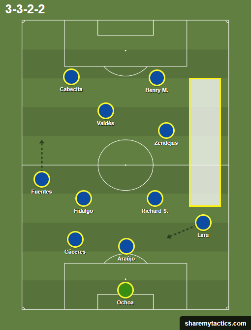 Claro, si Fuentes era el lateral encargado de pisar zonas ofensivas, Lara cerraba como tercer central y no se incorporaba (salvo alguna acción aislada en la que el 1v1 fuese evidente). La consecuencia, que no había nadie aprovechando los movimientos con/sin balón de Zendejas.