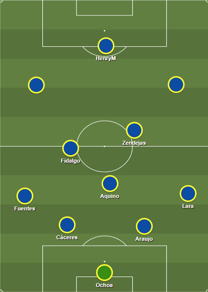 Primero, vamos con el once inicial del Club América: Ochoa; Lara, Araújo, Cáceres, Fuentes; Richard Sánchez, Fidalgo; Zendejas, Valdés, Cabecita y Henry Martín.