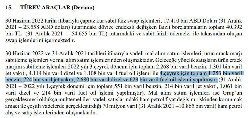 Ayrıca vade belirtilmemiş 70 milyon varil (6,4 milyon ton) ham petrol hedge işlemi var #tuprs