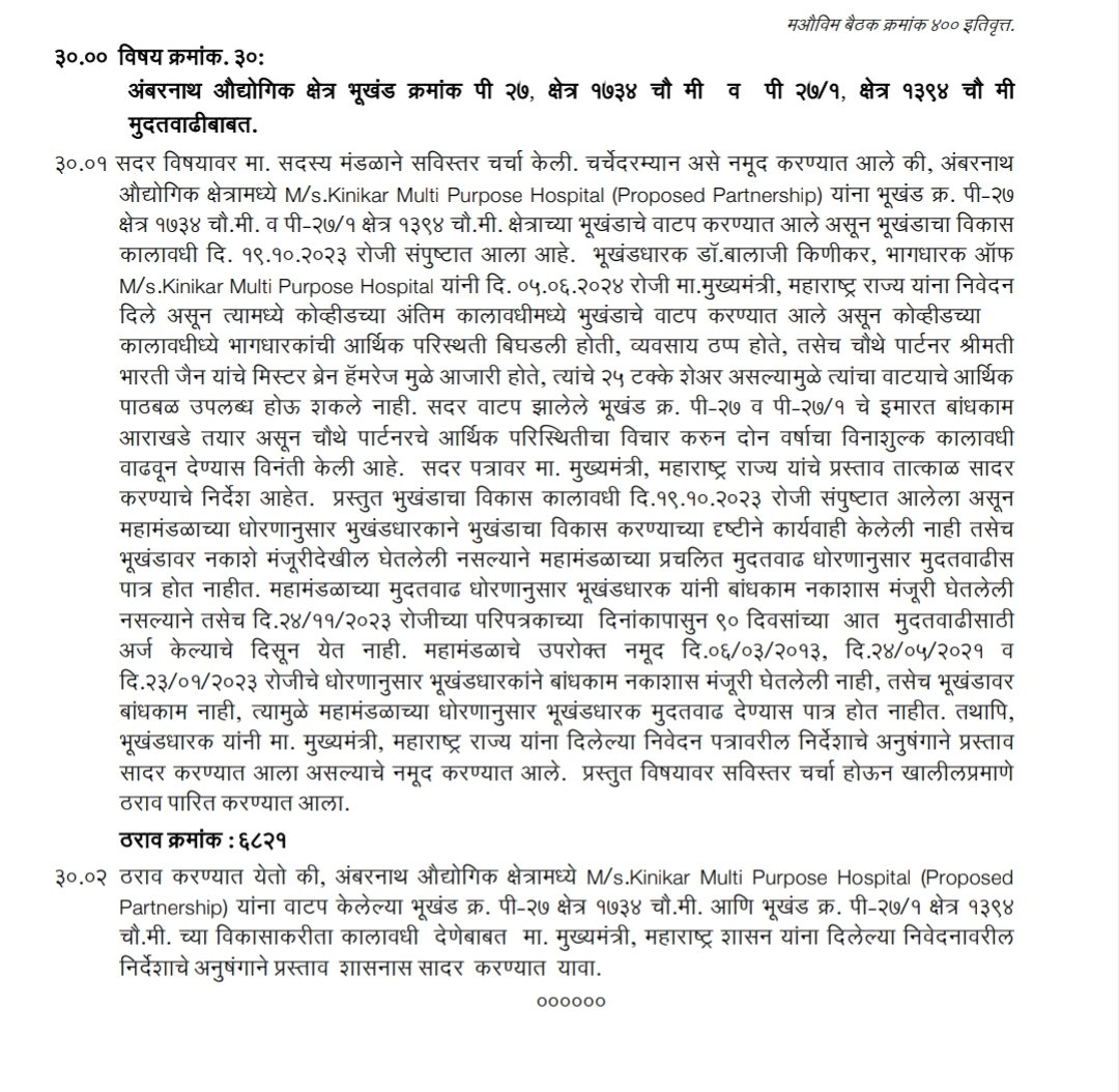 भूखंच क्रमांक पी 27, क्षेत्र 1734 चौ मी, पी 27/1, क्षेत्र 1394 चौ मी हा भूखंड M/s.Kinikar Multi Purpose Hospital, शिवसेना मिनिस्टर बालाजी किणीकर, यांना लोक-कल्याणासाठी भूखंड 29/08/2018 रोजी नाममात्र दरात वाटप करण्यात आला होता. (1/5