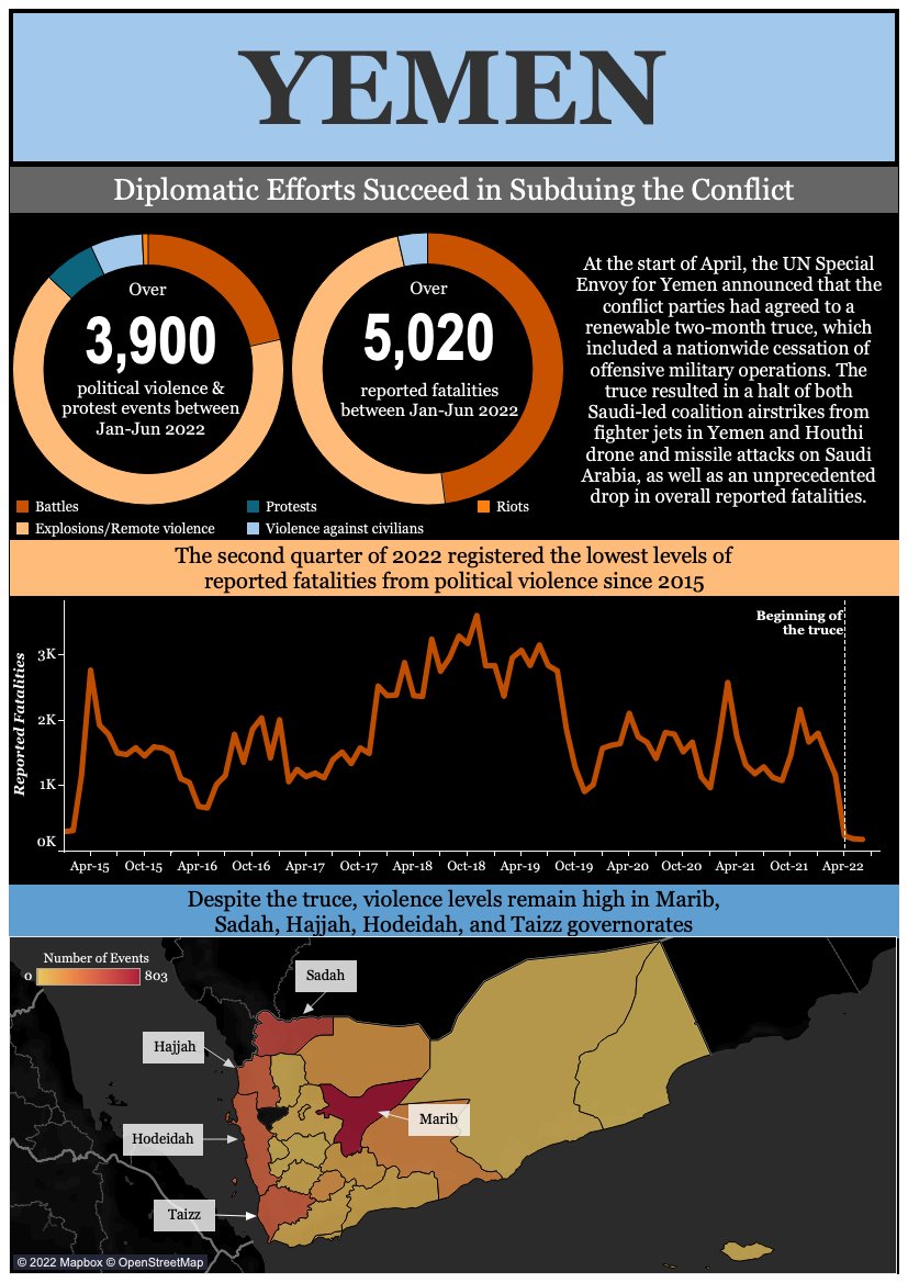 The UN-mediated truce has resulted in an unprecedented drop in overall reported fatalities in #Yemen, with the second quarter of 2022 registering the lowest number since 2015. Still, violence levels remain high in Marib, Sadah, Hajjah, Hodeidah, and Taizz governorates.