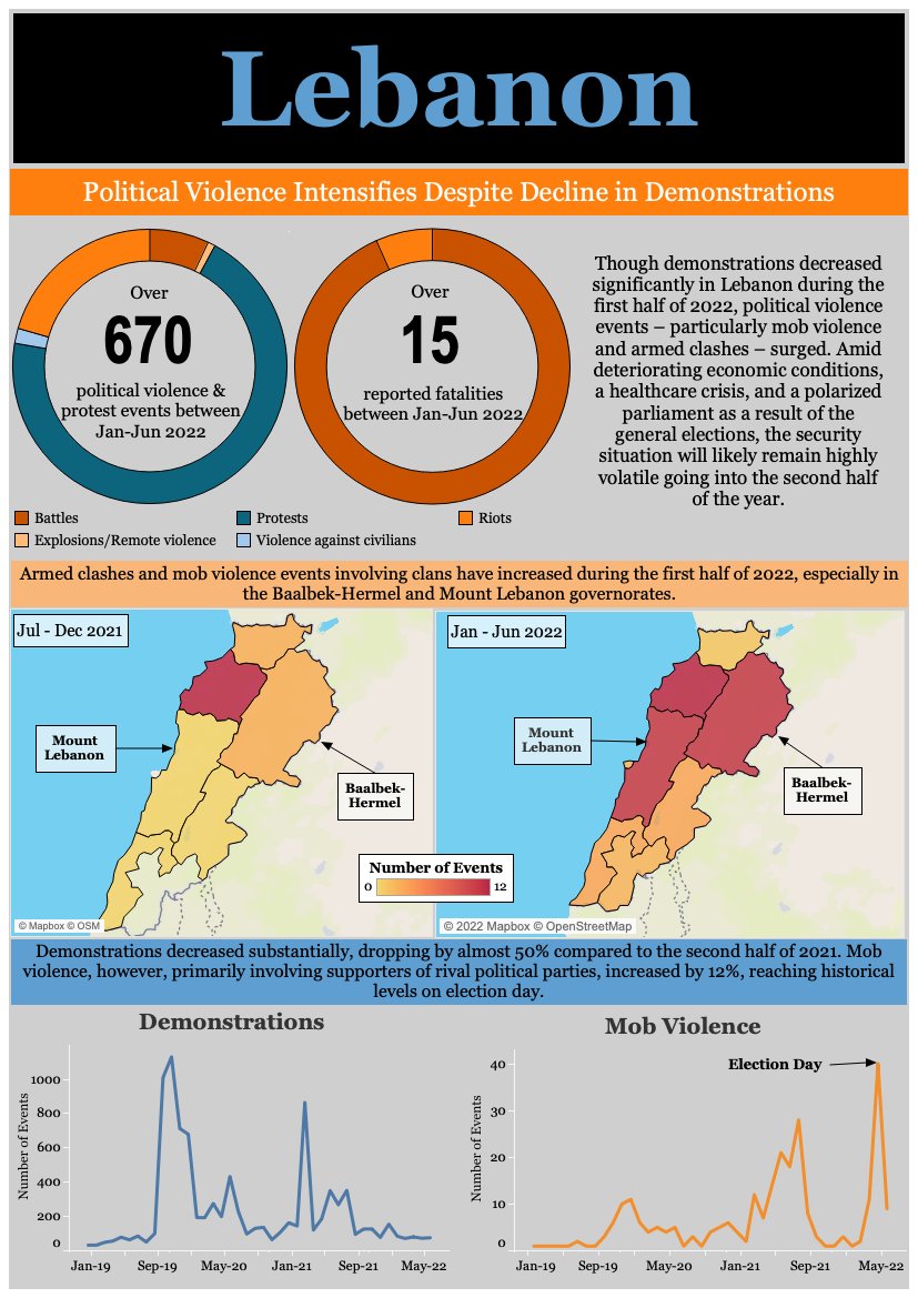 Though demonstrations decreased significantly in #Lebanon during the first half of 2022, political violence events spiked. Amid deteriorating economic conditions, the security situation will likely remain highly volatile through the second half of the year.