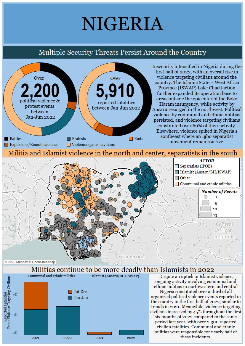 Insecurity intensified throughout #Nigeria during the first half of the year, with a 45% increase in violence targeting civilians compared to the same time period in 2021, resulting in over 2,300 reported fatalities.