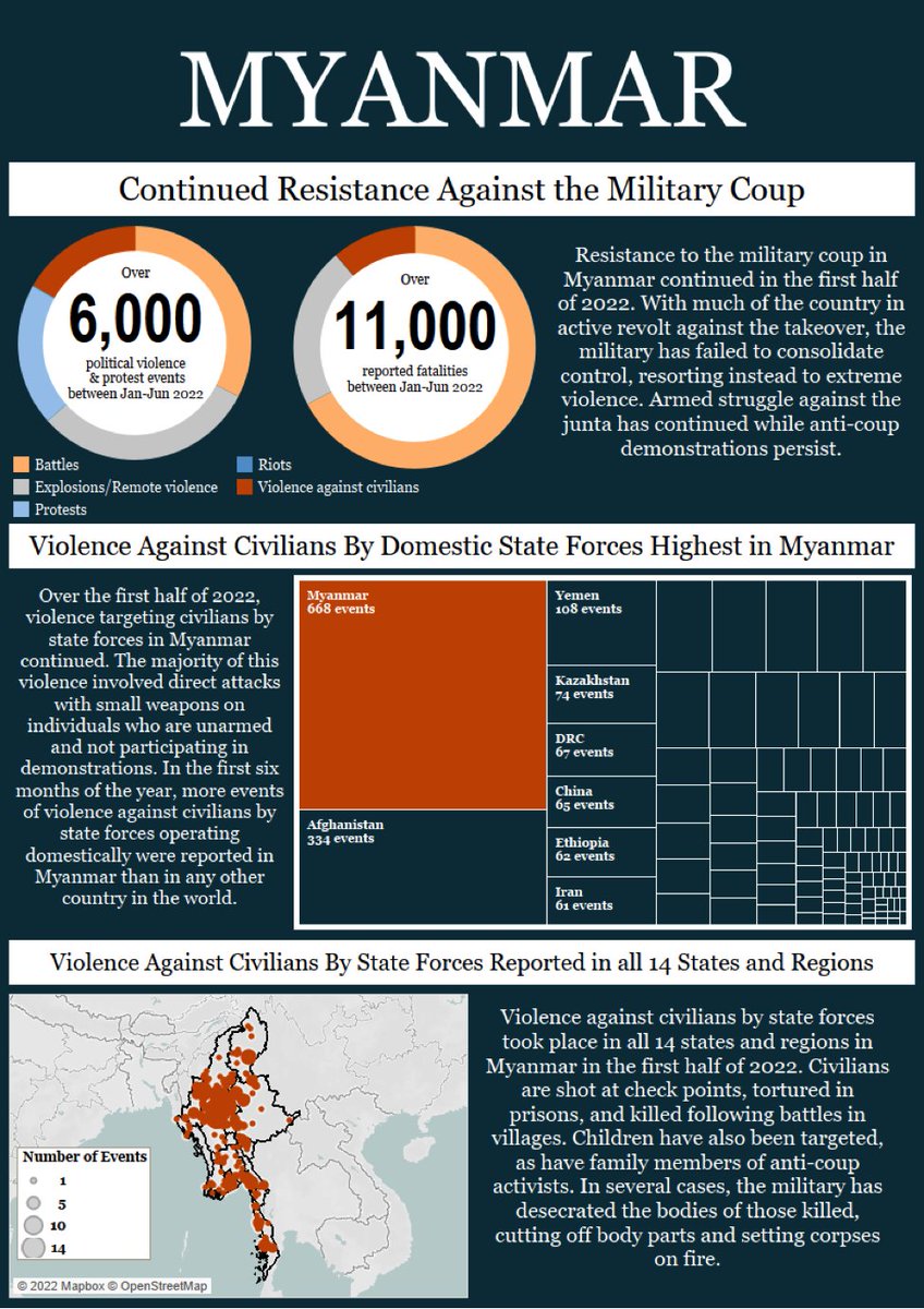 Unable to consolidate control, the military junta in #Myanmar continues to resort to extreme violence. During the first half of 2022, more incidents of violence against civilians by state forces operating domestically were reported in Myanmar than any other country in the world.