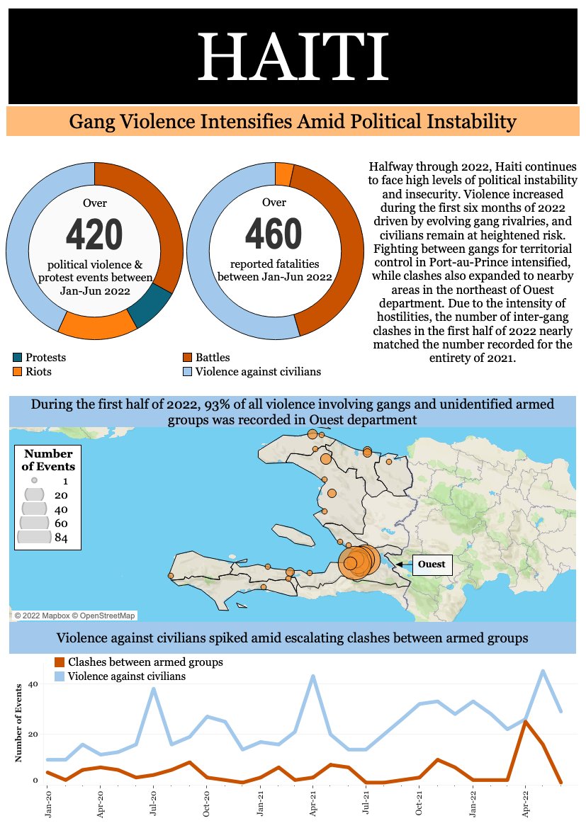 Violence intensified and spread geographically in #Haiti during the first half of 2022, with the emergence of new conflicts between gangs and ongoing attacks on civilians. The number of inter-gang clashes has already nearly matched the number recorded for the entirety of 2021.